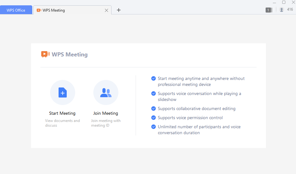 - Supports voice conversation and collaborative document editing when using WPS meeting.,